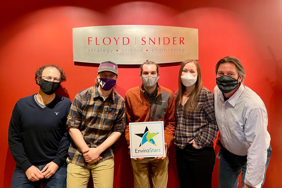 Floyd|Snider is pleased to announce that the firm has been recognized as an EnviroStars Tier 2 Partner by the Washington State EnviroStars Program! The EnviroStars Program is structured as a checklist, with businesses gaining points for each green action taken in a variety of categories, including energy conservation, pollution prevention, solid waste, wastewater, and water conservation. Floyd|Snider scored a total of 425 points, well above the threshold of 300 points for Tier 2 recognition, which establishes the firm as a sustainable business leader in the Puget Sound region.